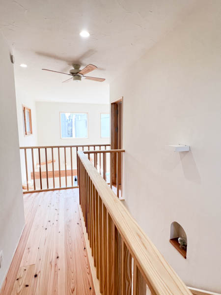 二階も杉の床で仕上げています。柵やシーリングファンの羽も杉材をふんだんに使用しています。