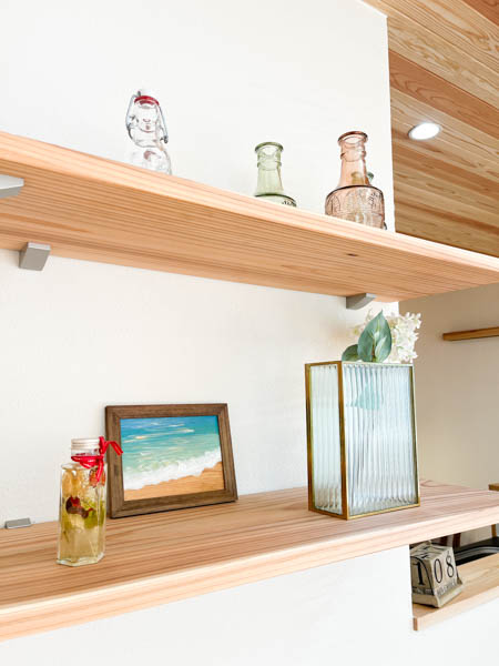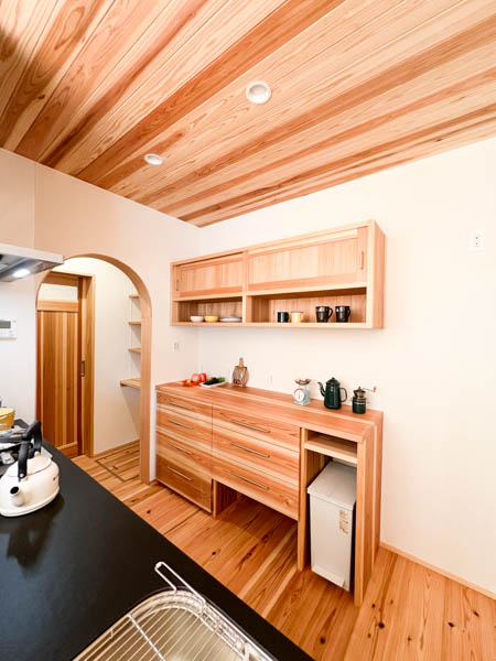 キッチンには杉の造作カップボードを造り付けています。
