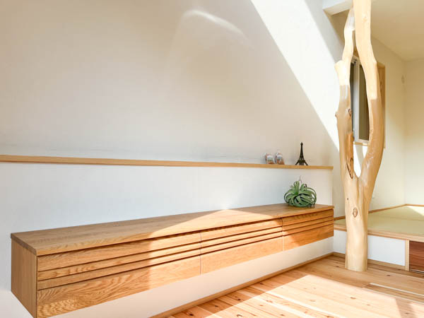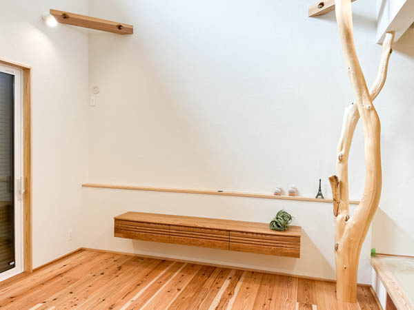 リビングには銘木のシンボルツリーがあります。杉田工務店のしっくいと木の自然素材を活かせるお家づくりならではの