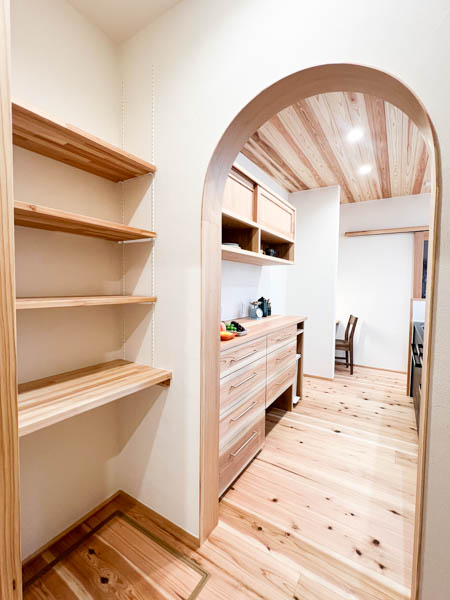 玄関ホールからすぐキッチンに行くことが出来てキッチンの奥にはパントリースペースも設けているので