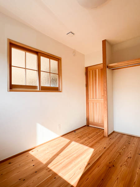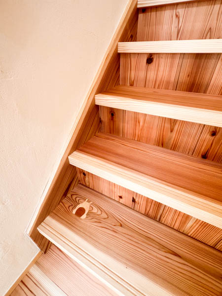 床は3㎝の一枚板の杉です。壁天井はエスタコウォールというスペイン生まれのしっくいを使用しており、