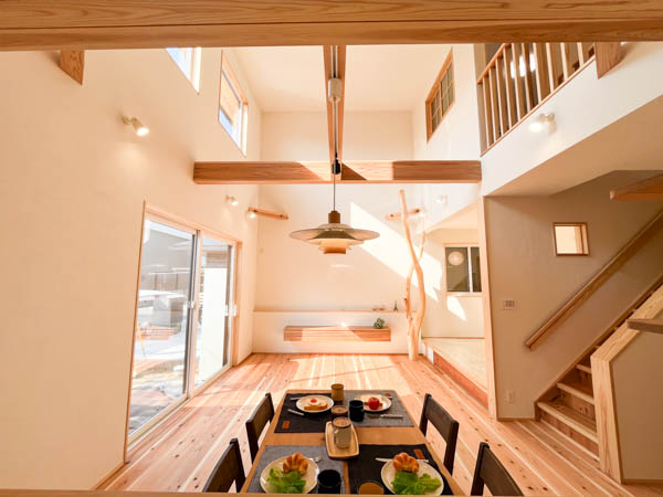 キッチンの前には広さ約20帖ほどある大きな吹き抜けのリビングダイニングスペースが広がり