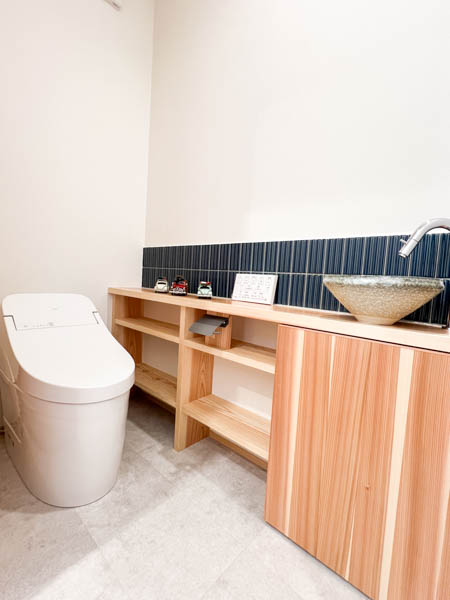 洗面のタイルは平田タイルの『セドル 品番CED-GB』トイレは『ソフィ 品番SPHI-613BB』をご選定頂きました。